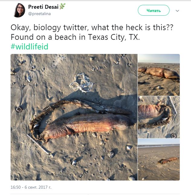 Неизвестное морское существо жуткого вида выбросило на один из техасских пляжей после урагана "Харви". Об этом сообщает Dailymail.