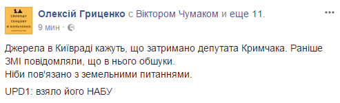 Ранее активист Алексей Гриценко сообщил в Fаcebook о задержании НАБУ депутата Киевского городского совета Сергея Крымчака. Сути обвинений он не изложил.