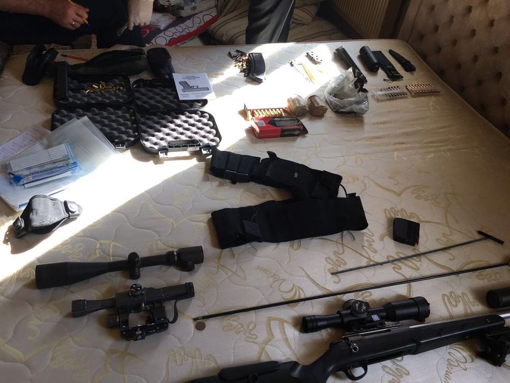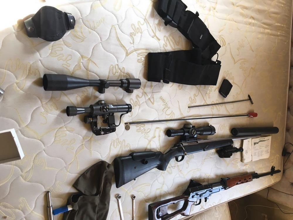 В ходе обыска обнаружены и изъяты самодельное взрывное устройство, автомат Калашникова АК-74У, снайперская винтовка, винтовка иностранного производства Tikka, три пистолета марки Glock, пистолет Макарова и более 500 патронов к оружию, 6 гранат, глушители, тепловизоры, приборы ночного видения, военная форма, балаклавы и денежные средства в сумме более $36 тыс.