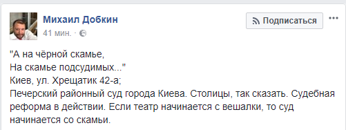 "А на черной скамье, На скамье подсудимых..." Киев, ул. Хрещатик 42-а; Печерский районный суд города Киева. Столицы, так сказать. Судебная реформа в действии. Если театр начинается с вешалки, то суд начинается со скамьи", - пишет Добкин.