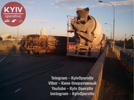 "После столкновения между собой двух грузовиков на улице Богатырской (путепровод над проспектом Степана Бандеры) одна из них перевернулась на бок. Ждут полицию. Большая пробка", - говориться в сообщении.