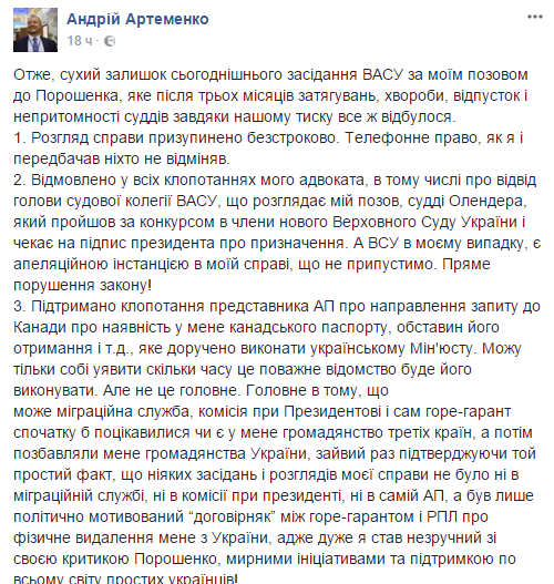 "Телефонное право, как я и предсказывал никто не отменял. Отказано во всех ходатайствах моего адвоката, в том числе об отводе председателя судебной коллегии ВАСУ, рассматривающей мой иск, судьи Олендера, который прошёл по конкурсу в члены нового Верховного Суда Украины и ожидает подписи президента о назначении. А ВСУ в моем случае является апелляционной инстанцией в моем деле, что недопустимо. Прямое нарушение закона! Поддержано ходатайство представителя АП о направлении запроса в Канаду о наличии у меня канадского паспорта, обстоятельств его получения и т.д., которое поручено выполнить украинскому Минюсту", - написал Артеменко.