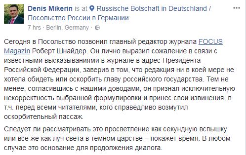 Главный редактор журнала Focus Роберт Шнайдер позвонил в посольство РФ в Германии с извинениями по поводу появления на страницах издания некорректных формулировок по отношению к российскому президенту Владимиру Путину. Об этом в Facebook сообщил пресс-атташе посольства Денис Микерин.