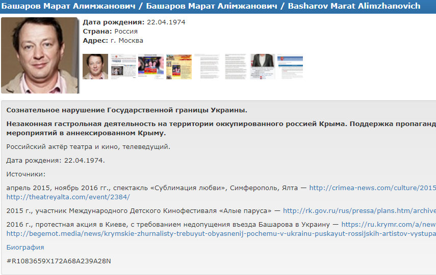 Он попал в базу сайта, традиционно, за поездки в аннексированный Крым через территорию России и "поддержку российских пропагандистов".