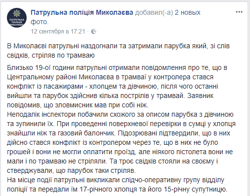 В Николаеве патрульные полицейские задержали несовершеннолетнего, который после ссоры с контролером открыл огонь из оружия по городскому трамваю. Об этом сообщает пресс-служба местной полиции.
