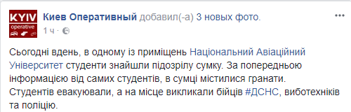В Киеве сегодня днем, 15 сентября, в одном из помещений Национального авиационного университета студенты нашли подозрительную сумку, в которой находились гранаты. Об этом со ссылкой на самих студентов сообщает dtp.kiev.ua.