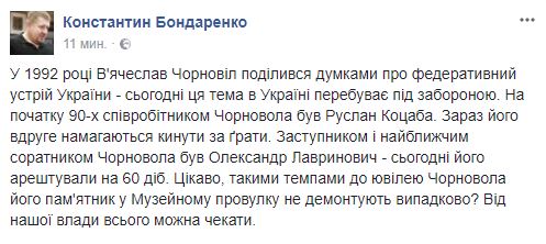 "В 1992 году Вячеслав Чорновил поделился мыслями о федеративном устройстве Украины - сегодня эта тема в Украине находится под запретом. В начале 90-х сотрудником Чорновила был Руслан Коцаба. Сейчас его второй раз пытаются бросить за решетку. Заместителем и ближайшим соратником Чорновила был Александр Лавринович - сегодня его арестовали на 60 суток", - пишет Бондаренко.