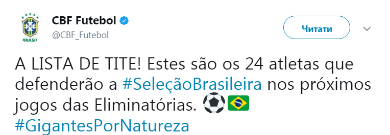 "Эти 24 спортсмена, которые будут защищать #SeleçãoBrasileira (сборную Бразилии - прим.) в предстоящих отборочных матчах. #Гиганты по природе", - говорится в опубликованном сообщении.