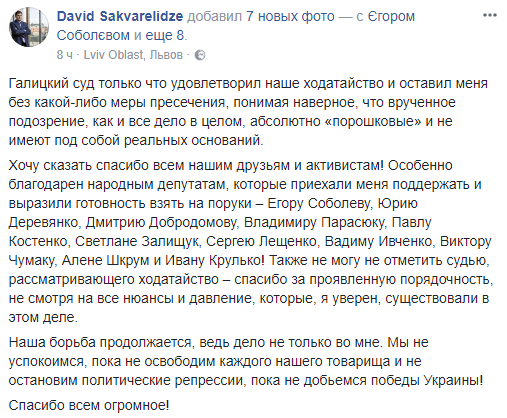 Сакварелидзе поблагодарил за поддержку нардепов, которые выразили готовность взять его на поруки – Егора Соболева, Юрия Деревянко, Дмитрия Добродомова, Владимира Парасюка, Павла Костенко, Светлану Залищук, Сергея Лещенко, Вадима Ивченко, Виктора Чумака, Алену Шкрум и Ивана Крулько.