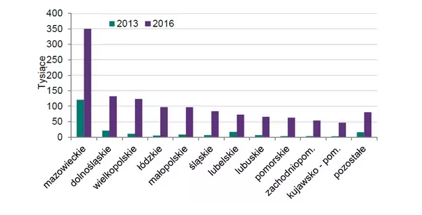 Характерно, что еще в 2013 году более половины (56%) украинских работников работали в Мазовецком воеводстве (включая Варшаву). По результатам же 2016 года доля столичного региона упала до 28%. Украинцы стали чаще работать в других воеводствах.