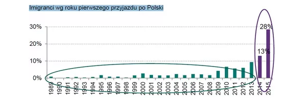 Особенностью же последних трех лет стало появление новых мигрантов. 41,3% приехали в Польшу впервые в 2014 году или позже. Более того, исследования показывают увеличение процента людей, впервые приезжающих на работу в эту страну.