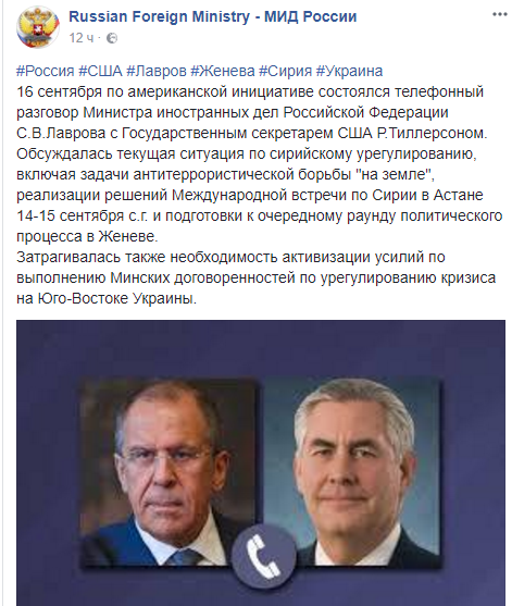 16 сентября глава МИД РФ Сергей Лавров и госсекретарь США Рекс Тиллерсон провели телефонный разговор. Об этом сообщает МИД России в Facebook.