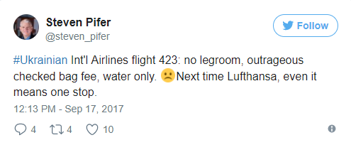 "Рейс" Международных авиалиний Украины "423: нет места для ног (рост мужчины достигает 190 сантиметров), бешеные цены на зарегистрированный багаж (checked bag fee), дают только воду. В следующий раз полечу самолетом Lufthansa, если даже будет одна остановка ", - сообщил в своем микроблоге Пайфер.