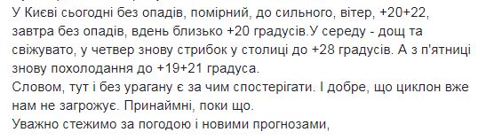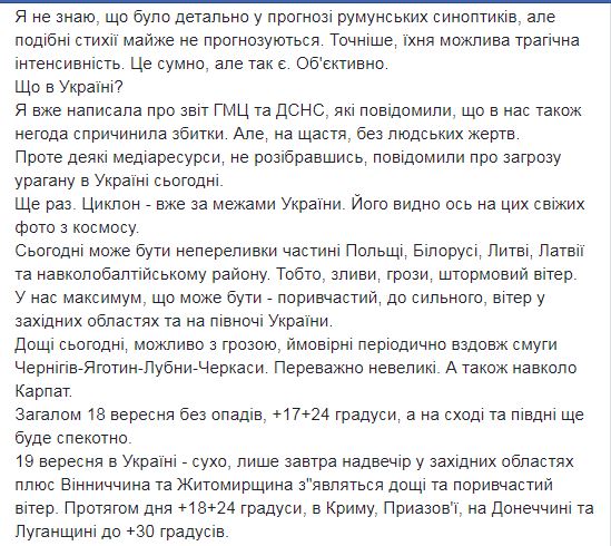 "Еще раз. Циклон – уже за пределами Украины. У нас максимум, что может быть – порывистый, до сильного, ветер в западных областях и на севере Украины", – подчеркнула синоптик.