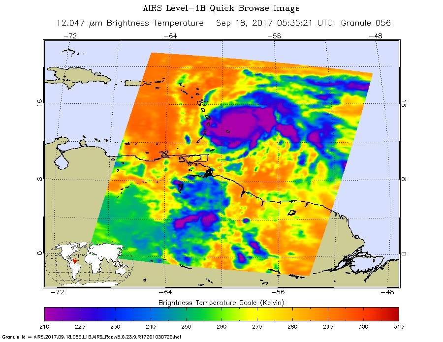 Космический спутник NASA показал инфракрасный вид Марии, что показывает высокие температуры охлаждения, а спутник NOES обеспечил анимацию изображений, которые демонстрировали развитие и усиление шторма.