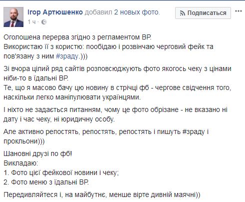 "Пообедаю и развенчаю очередной фейк и связанную с ним зраду. Со вчерашнего дня целый ряд сайтов распространяют фото какого-то чека с ценами якобы в столовой ВР", - пишет он.