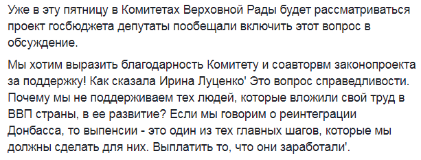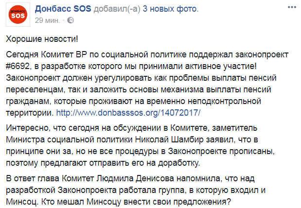Также данный законопроект №6692 призван урегулировать проблемы выплаты пенсий переселенцам, передает на Facebook сообщество "Донбасс SOS".