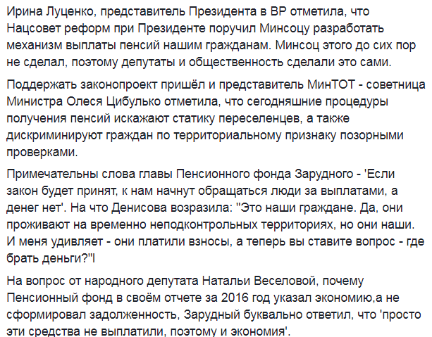 На вопрос от народного депутата Натальи Веселовой, почему Пенсионный фонд в своём отчете за 2016 год указал экономию,а не сформировал задолженность, Зарудный буквально ответил, что 'просто эти средства не выплатили, поэтому и экономия'.