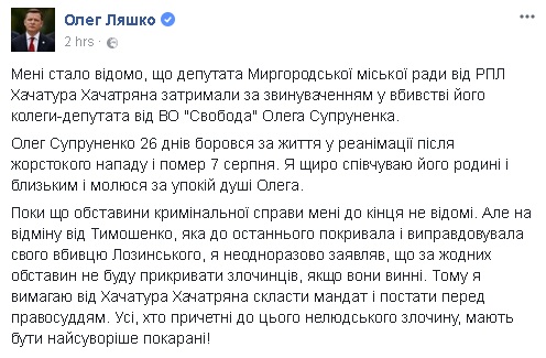 Депутата миргородского горсовета от Радикальной партии Хачатура Хачатряна задержали по обвинению в убийстве депутата от ВО "Свобода" Олега Супруненко. Об этом написал глава партии Олег Ляшко у себя в Facebook.