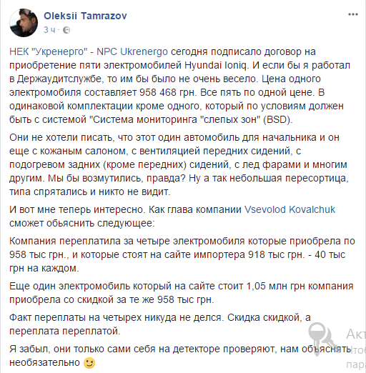 "Они не хотели писать, что этот один автомобиль для начальника и он еще с кожаным салоном, с вентиляцией передних сидений, с подогревом задних (кроме передних) сидений, с лед фарами и многим другим. Мы бы возмутились, правда? Ну а так небольшая пересортица, типа спрятались и никто не видит", - написал он.