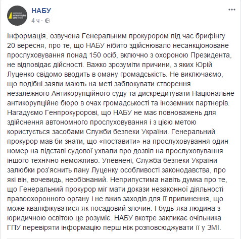 Информация, которую озвучил Генеральный прокурор Украины Юрий Луценко, что Бюро незаконно прослушивала более 150 человек, включая охрану президента, не соответствует действительности. Об этом говорится в сообщении НАБУ на странице в Facebook.