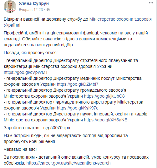"Открыли вакансии на государственную службу в Министерство здравоохранения Украины. Профессиональные, амбициозные и целеустремленные специалисты, ждем вас в нашей команде. Выбирайте вакансию согласно вашим компетенциям и подавайтесь на конкурсный отбор", — написала Супрун и разместила ссылки на вакансии.