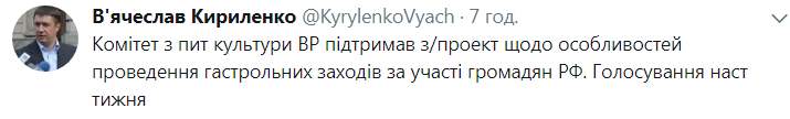 Члены Комитета Верховной Рады по вопросам культуры и духовности порекомендовали парламенту принять в первом чтении законопроект №6682 об обязанности организаторов гастрольных мероприятий при участии артистов из России сообщать об этом в СБУ за 30 дней до мероприятия.