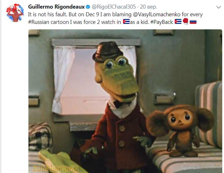 "Это не его вина. Но 9 декабря я буду мстить Ломаченко за каждый русский мультфильм, который меня заставляли смотреть в детстве", - написал Ригондо в Twitter-микроблоге, прикрепив к записи кадр из "Крокодила Гены".