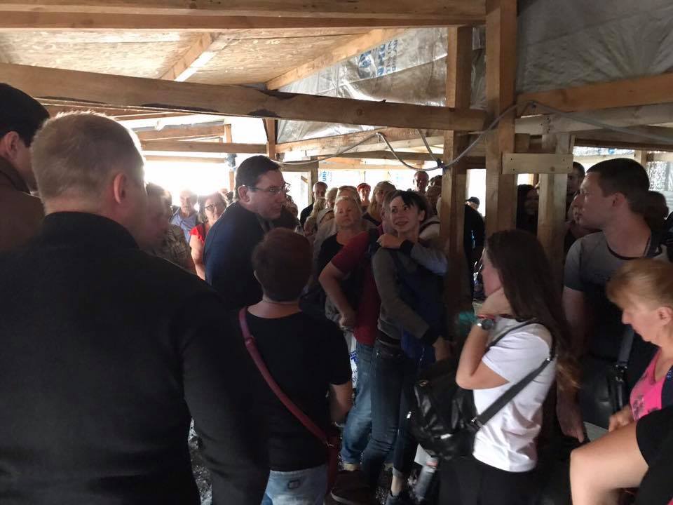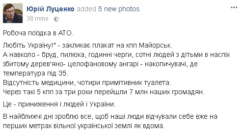 "Любите Украину - призывает плакат на кпп "Майорск", а вокруг - грязь, пыль, часовые очереди, сотни людей с детьми в наспех сбитом деревяно-целлофановом ангаре-накопителе, где температура под 35", - написал Луценко на своей странице в Facebook.
