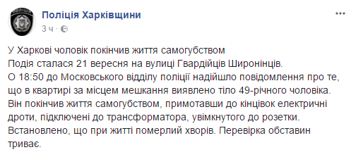 В Харькове 49-летний мужчина покончил жизнь самоубийством. Об этом сообщают в отделе коммуникации Нацполиции Харьковской области в Fаcebook.