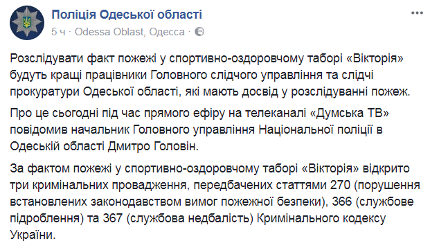 "По факту пожара в спортивно-оздоровительном лагере "Виктория" открыто три уголовных производства по признакам статей 270 (нарушение установленных законодательством требований пожарной безопасности), 366 (служебный подлог) и 367 (служебная халатность) Уголовного кодекса Украины. Создана совместная рабочая группа, в состав которой вошли как работники прокуратуры и полиции Одесской области, так и лучшие сотрудники Главного следственного управления НПУ", - отметил глава Одесского главного управления Нацполиции Дмитрий Головин.