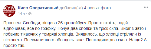 В Киеве сегодня ночью, 23 сентября, подростки расстреляли троллейбус №26 на конечной остановке на проспекте Свободы. Об этом пишет "Киев Оперативный" в Facebook.