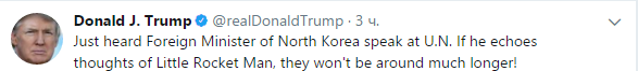 "Только что услышал выступление министра иностранных дел Северной Кореи в ООН. Если он озвучивает мысли маленького человека-ракеты (Ким Чен Ына ),то их не будет больше", - заявил Трамп.