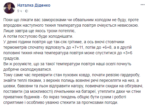 Синоптик Наталья Диденко прогнозирует заметное понижение ночной температуры к концу недели. Об этом она написала в своем Facebook.
