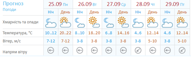 Ресурс Мeteoprog.ua также предвидит постепенное снижение температуры, начиная с понедельника. С +22 25 сентября в Киеве похолодает до +13 к выходным. Ресурс не обещает осадков. 28 и 29 сентября прогнозирует солнечную погоду.