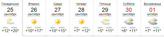 Сайт Sinoptik.ua дает похожий прогноз. В понедельник еще обещают +20. Во вторник-среду +15...+17 днем. С четверга днем термометры покажут +11...+12. При этом с 26 по 28 сентября включительно будет ясная погода. В воскресенье обещают дождь.