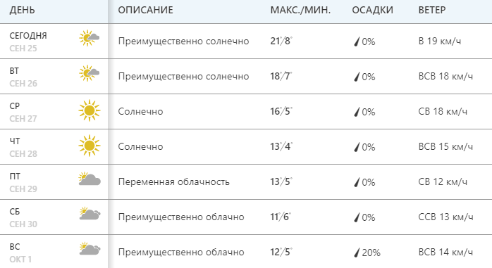 Сайт Weather.com также обещает снижение температуры до +11...+13 со среды, 27 сентября. Ночью при этом будет +4...+5. Дождей не предвидится. 27 и 28 сентября - ясно.