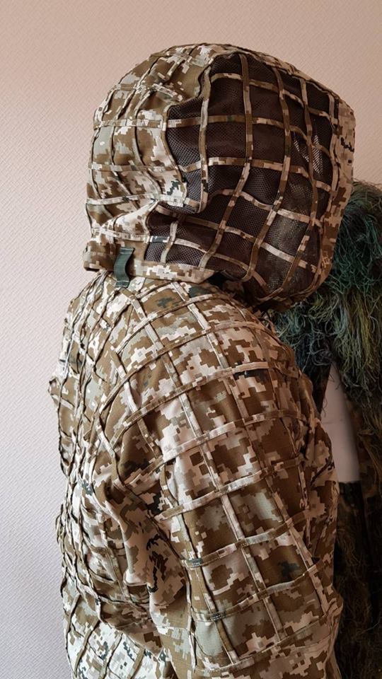 Манжеты рукавов продлены - они скрывают почти всю ладонь. Маскировочная сетка капюшона защищает от паразитов и маскирует снайпера и основную часть оружия. В брюках предусмотрены отверстия для быстрого доступа к подкостюмному пространству. Наличие эластичных шнуров и фиксаторов позволяют подогнать костюм под себя.