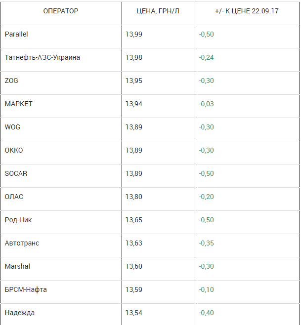 Оператор Надежда снизил стоимость на 40 коп./л до 13,54 грн/л. В сети Parallel цена снизилась на 50 коп./л до 13,99 грн/л, на АЗС ZOG – на 30 коп./л до 13,95 грн/л.