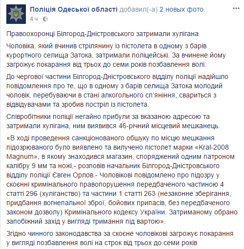 В дежурную часть Белгород-Днестровского отдела полиции поступило сообщение о том, что в одном из баров поселка Затока мужчина, находясь в состоянии алкогольного опьянения, ссорится с посетителями и выстрелил из пистолета. Сотрудники полиции прибыли по указанному адресу и задержали хулигана, им оказался 46-летний местный житель.