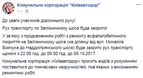 "В связи с продолжением работ по ремонту асфальтобетонного покрытия на Железнодорожном шоссе (на участке от ул. Михаила Бойчука до Надднепрянского шоссе) будет закрыто движение транспорта каждую ночь с 22:00 до 06:00 до 8 октября", – говорится в сообщении.