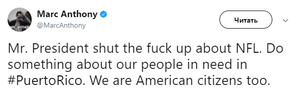 "Господин президент, заткнитесь ради бога относительно НФЛ. Сделайте что-то для наших людей, которые нуждаются в Пуэрто-Рико. Мы также граждане Америки", - подчеркнул он.