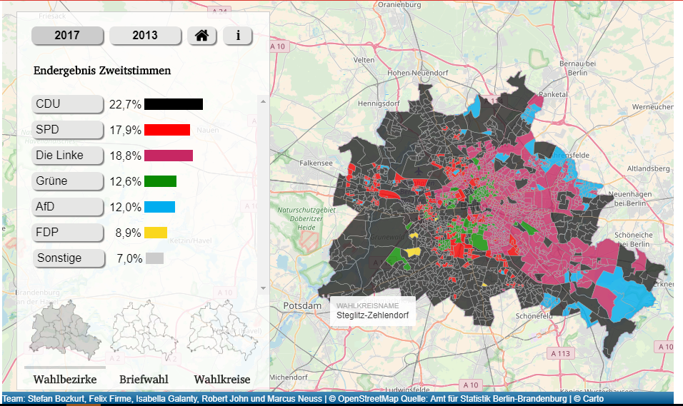 А правая "Альтернатива для Германии" (АдГ) тут только на пятом месте, тогда как по стране третья. Но по процентам соотношение примерно равное - 12,6% голосов по стране, и 12% в Берлине. Голосовали за радикалов в основном жители южных районов.
