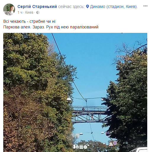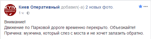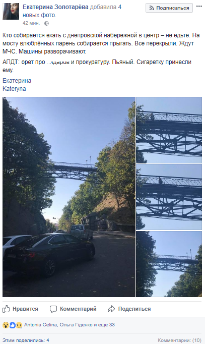"Кто собирается ехать с днепровской набережной в центр - не едьте. На мосту влюбленных парень собирается прыгать. Все перекрыли. Ждут МЧС. Машины разворачивают. АПДТ: орет про п*даров и прокуратуру. Пьяный. Сигаретку принесли ему", - написала она в Facebook.