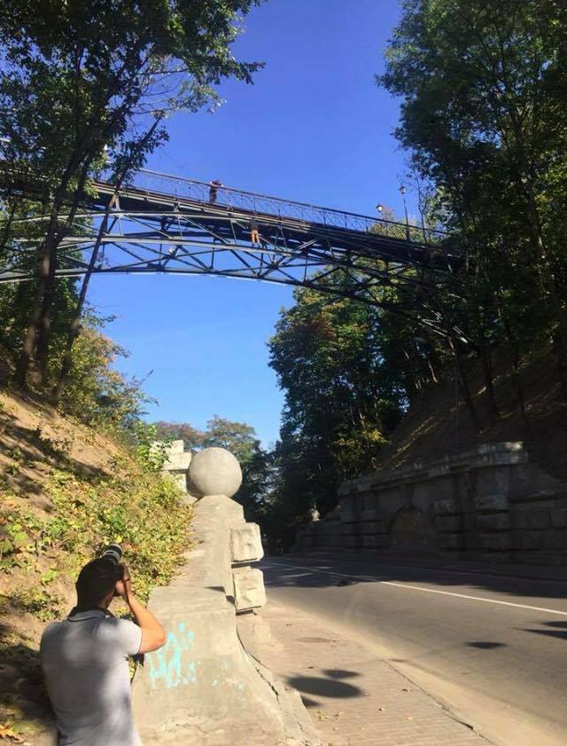 Появились фото парня, который второй час подряд грозится прыгнуть с Моста влюбленных в Киеве