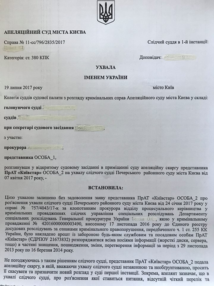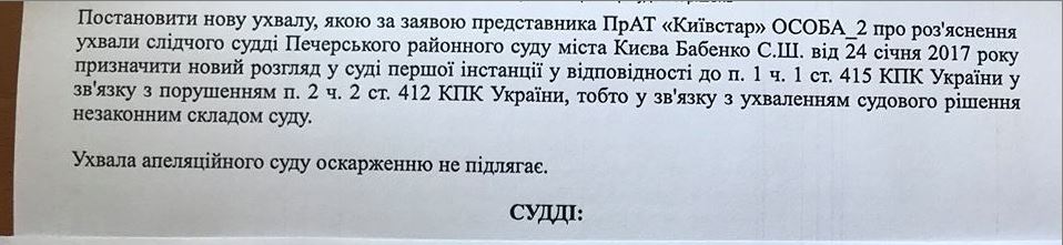 В тоже время, из опубликованных адвокатом документов понятно, что "Киевстар" подал апелляцию на решение Печерского суда и выиграл. В апелляционной жалобе указывалось, что решение суда является "непонятным и нечетким в отношении лиц, к которым оно применяется, так и в отношении лиц, которые будут его исполнять". Апелляционный суд жалобу "Киевстар" удовлетворил и решение Печерского суда отменил.