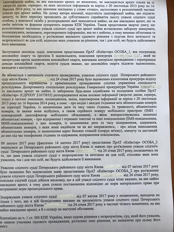 "Департамент специальных расследований Генпрокуратуры Украины прослушивает всех абонентов "Киевстар". Печерский районный суд фактически открыл доступ следователям ко всему оборудованию Киевстар с целью получения любой интересующей информации о телефонных разговорах и переписке, внимание, всех абонентов оператора мобильной связи, а это несколько миллионов человек!