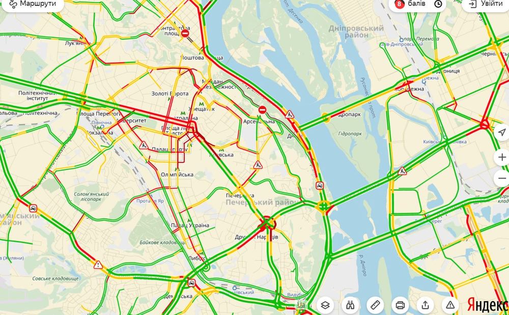 В Киеве вечером 26 сентября снова сложно проехать из-за пробок в центре. По данным Яндекс-карт заторы достигают 8 баллов из 10 возможных.