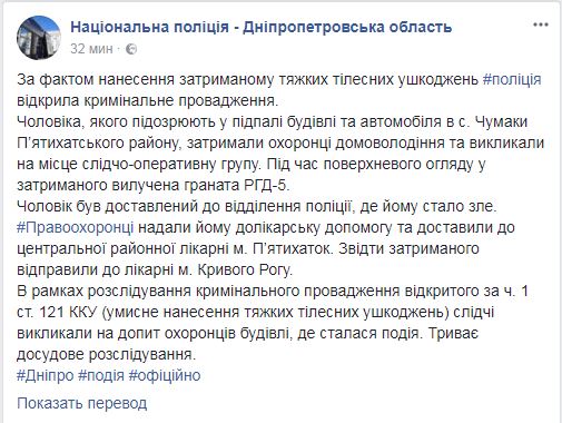 "Мужчину, которого подозревают в поджоге здания и автомобиля в селе Чумаки Пятихатского района, задержали охранники домовладения и вызвали на место следственно-оперативную группу. Во время поверхностного осмотра у задержанного изъята граната РГД-5", - сказано в сообщении.