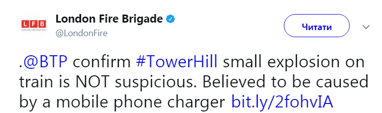 "Подтверждаем #TowerHill (станция метро в Лондоне- прим.) небольшой взрыв на поезде. Он не вызывает каких-либо подозрений. Предположительно, взрыв произошел из-за зарядки для мобильного телефона", - говорится в опубликованном сообщении.